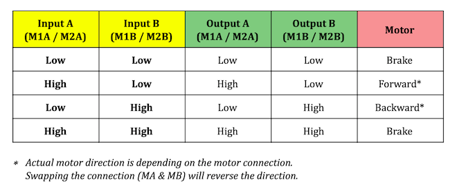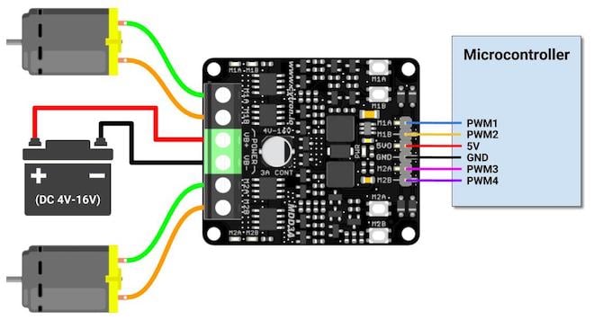 To prevent the motor driver from damaged by reverse voltage if the battery is connected in the wrong polarity, it is equipped with reverse polarity protection. This is a very common mistake done by a lot of makers even for the very experienced one.