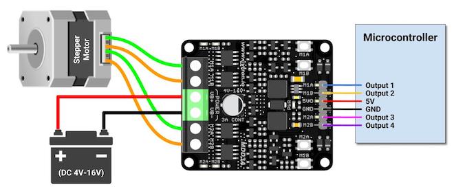 The onboard test buttons and motor output LEDs allow functional test of the motor driver in a quick and convenient way without hooking up the host controller. Buck-boost regulator which produces 5V output from input as low as 4V can be used to power the host controller.